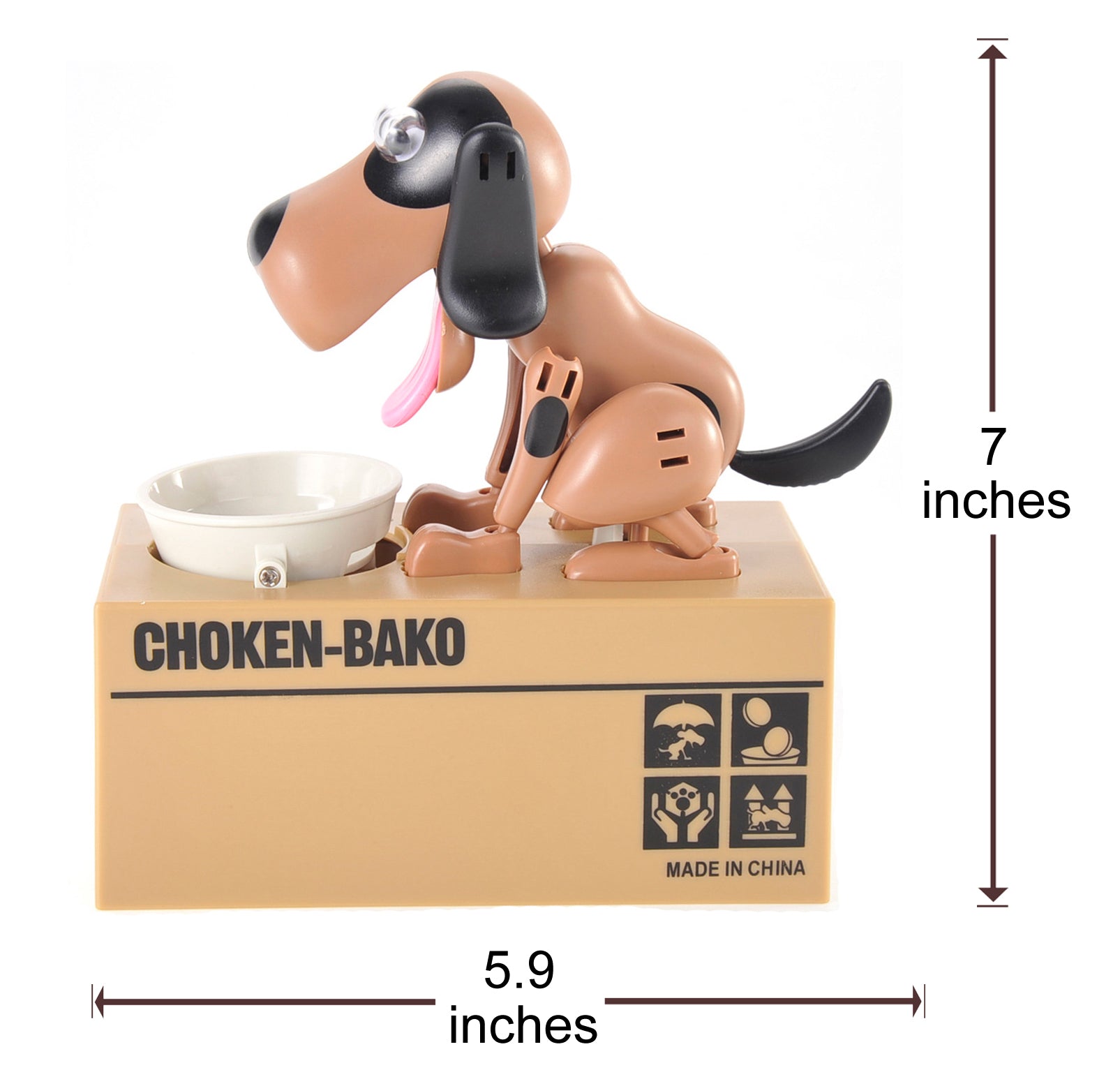 Give a hungry hound a coin! This adorable puppy is happy to save your coins in his savings box! Place a coin onto the tray, and watch as it happily munches away! The consumed coins are stored in the savings box -- what a fun way to save! (Powered by 2 x AA batteries -- not included).
